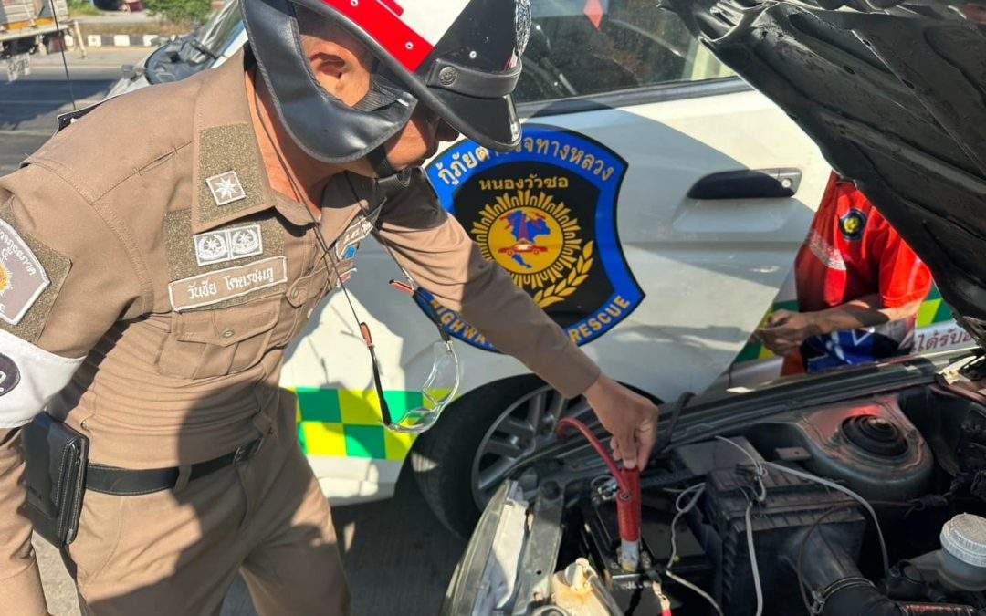 วันที่ 31 ต.ค.67 ร.ต.ต.วันชัย โคตรชมภู ร.ต.ต.จำนงค์ คำบุญมา ปฏิบัติหน้าที่จราจรเวรฯ พร้อมด้วย เจ้าหน้าที่กู้ภัยตำรวจทางหลวง ได้ให้ความช่วยเหลือประชาชนที่จะเดินทางไปงานบุญกฐินที่ จ.หนองบัวลำภู แต่เกิดเครื่องยนต์ดับอยู่กลางสี่แยกไฟแดงศูนย์บริการ จึงได้เข็นรถจอดข้างทางเพื่อไม่ให้การจราจรติดขัด และประสานช่างมาดำเนินการช่อมแซมจนสามารถเดินทางต่อไปได้